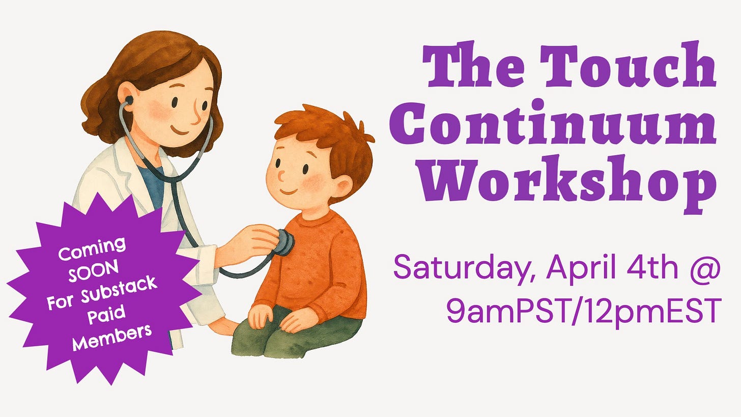 My upcoming workshop, The Touch Continuum, is based on Cordelia Anderson’s framework and is designed to give you practical tools to have these conversations with your children at every age. Because this work belongs to us, the adults. Not to the kids.
